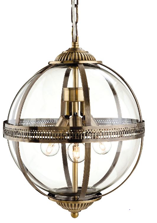 Classic Victorian style globe pendant featuring beautifully decorated metalwork and clear glass. Three lampholders ensure that it give plenty of light and the antique brass finish adds to it's traditional feel. A stunning centrepiece for any room.