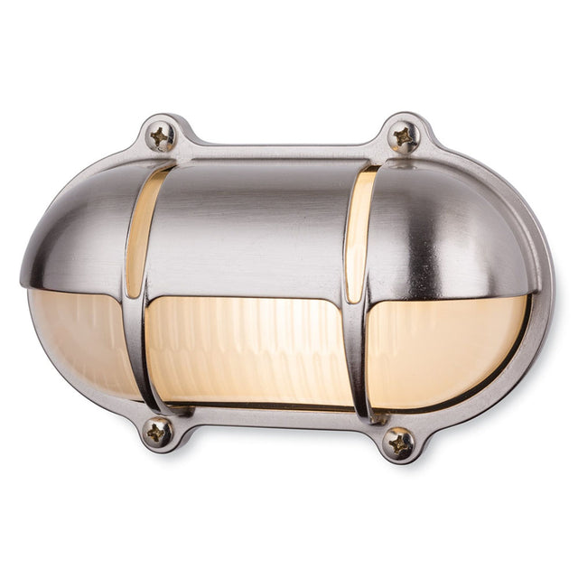 Traditional nickel plated solid brass ship style bulkhead with frosted glass. Attractive and practical and suitable for both indoor and outdoor use.